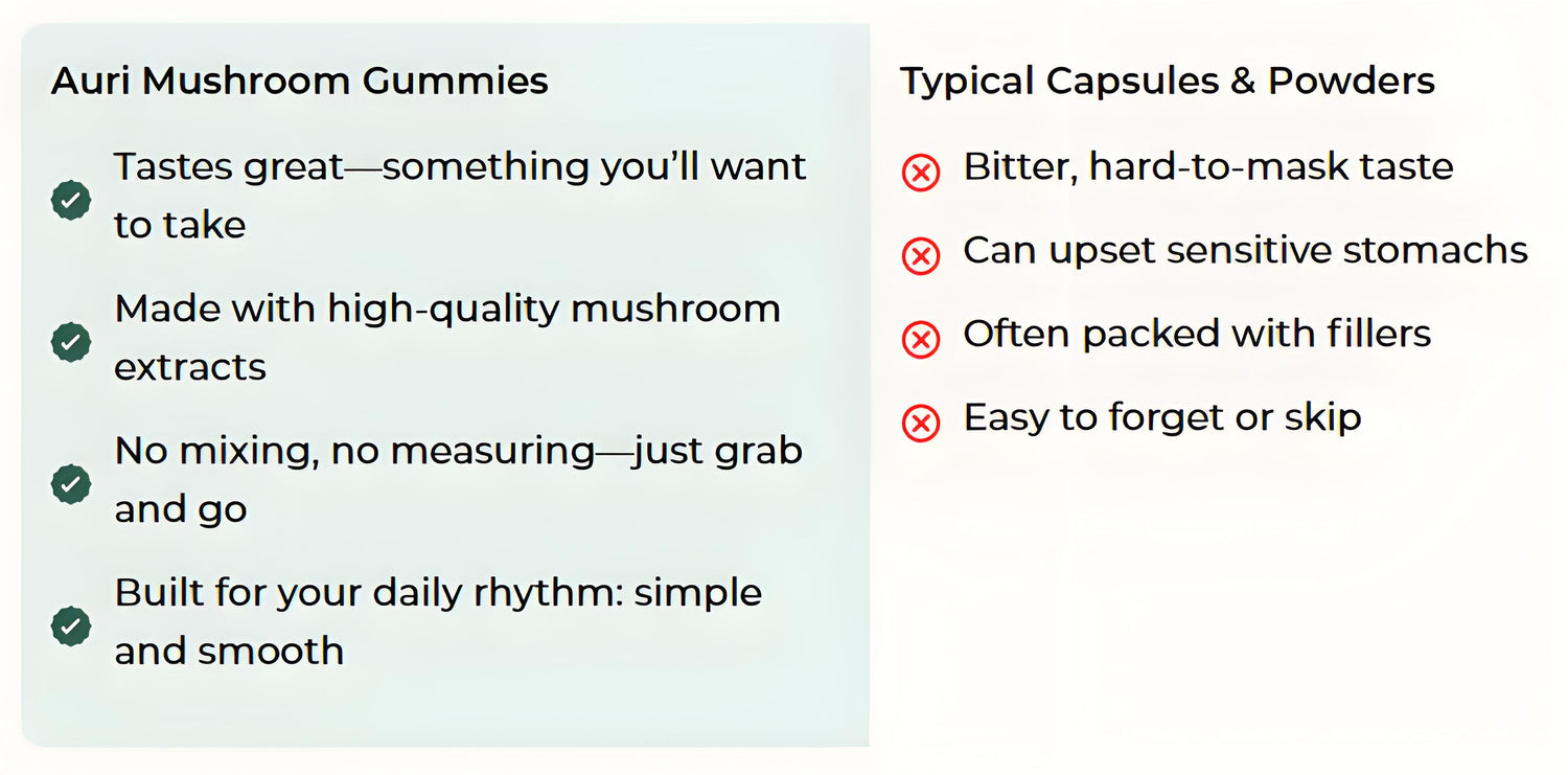 Powders can taste bitter and aren’t always convenient. Capsules can be harder to digest for some people. Gummies areeasy to take, taste great, and are crafted for optimal absorption and effectiveness.Plus, they make your daily routine something you’ll actually enjoy.